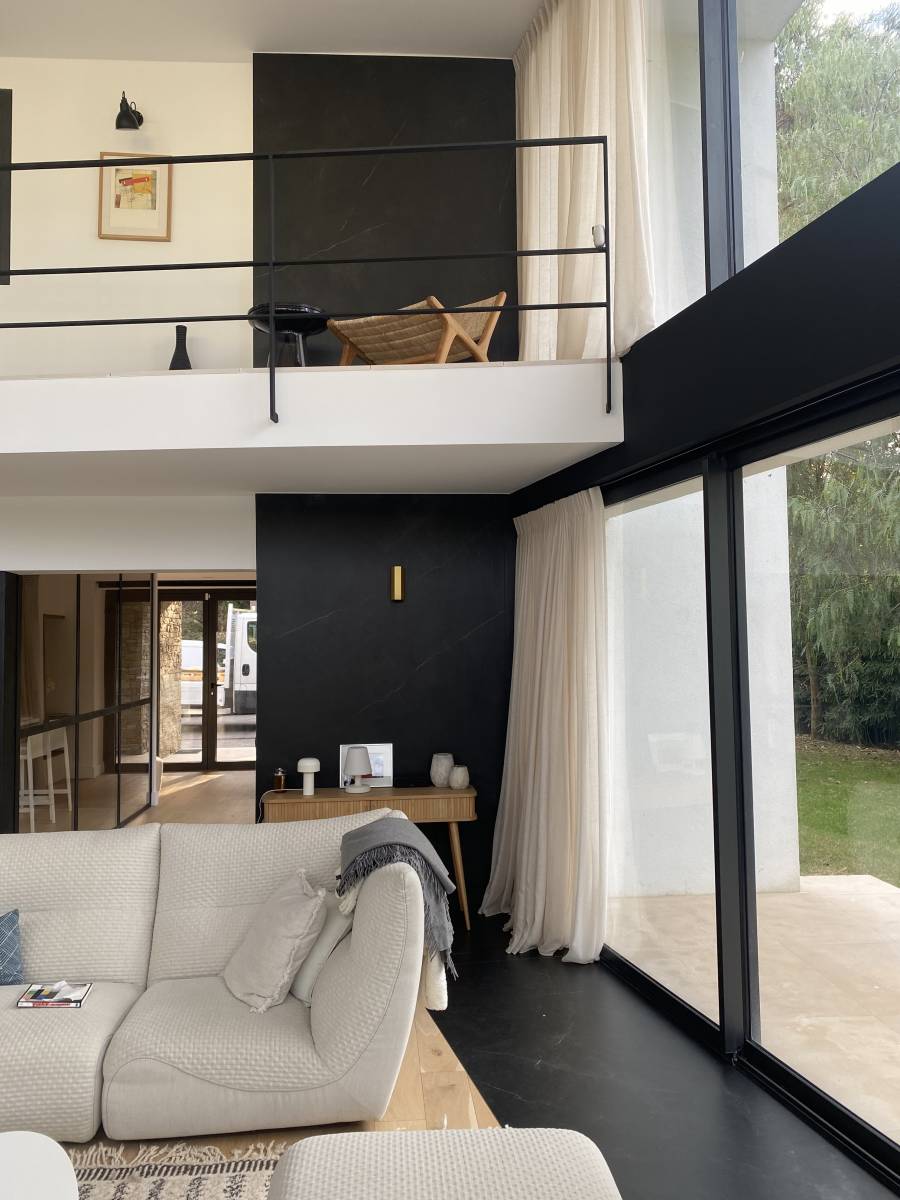 Ici, le client, n'a pas hésiter à mixer carrelage et parquet dans une même pièce, le salon, pour un effet décoratif et un intérieur très chic.