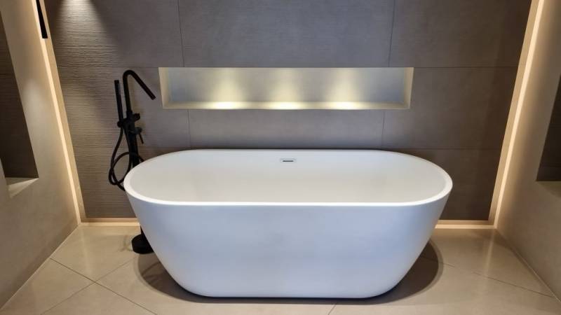 N'attendez plus pour créer la salle de bain de vos rêves ! Contactez-nous dès aujourd'hui pour découvrir notre gamme de carrelages, de mobilier de salle de bain et pour organiser la livraison de votre baignoire blanche avec robinetterie noire. Faites confiance à notre expertise pour transformer votre espace de bain en un havre de paix et de beauté fonctionnelle.